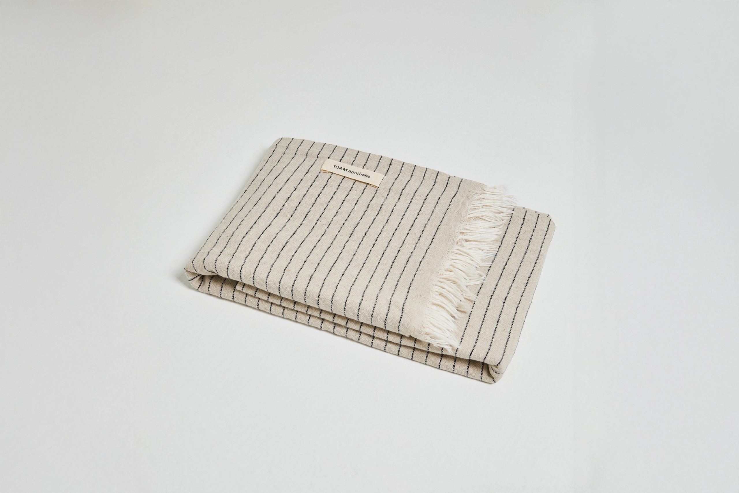 Made from a breathable blend of 70% linen and 30% cotton, this lightweight piece is designed to function as both towel and pareo. Linen brings natural crinkle and durability, while cotton offers softness and absorbency—together, they create an effortless, summer-ready texture. Its natural tone is traced with fine black stripes, forming a quiet, graphic rhythm. Light, quick-drying, and easy to fold, it’s made for the beach, the bath, or summer days in movement.