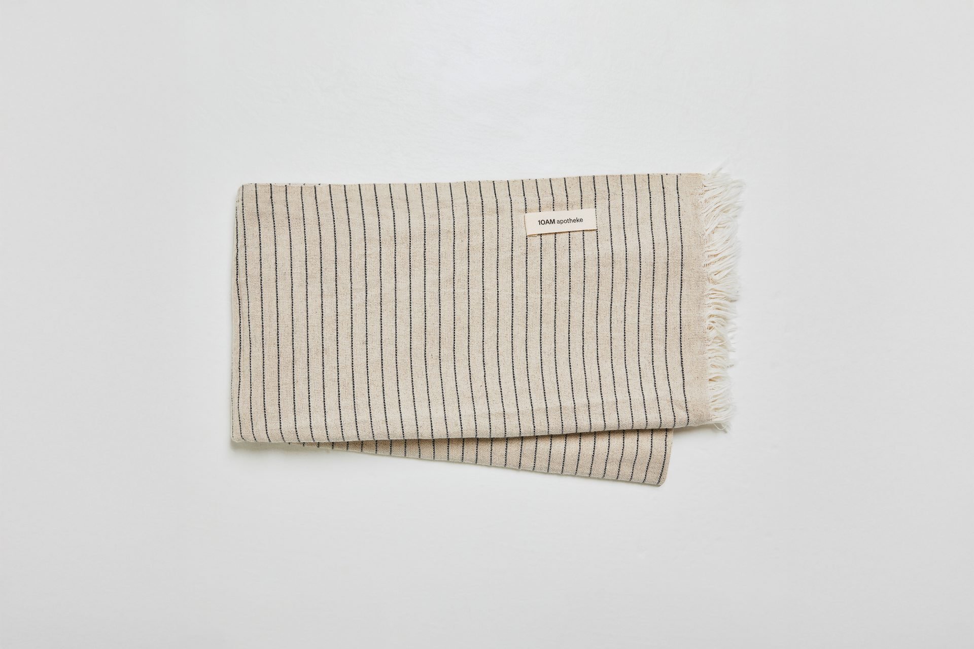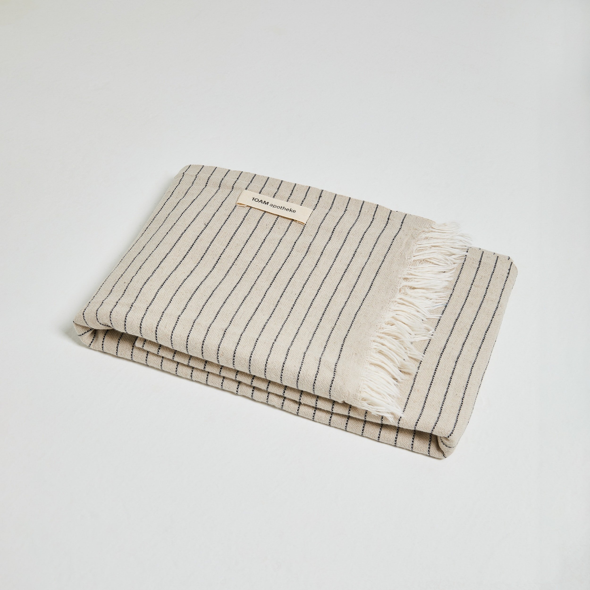 Made from a breathable blend of 70% linen and 30% cotton, this lightweight piece is designed to function as both towel and pareo. Linen brings natural crinkle and durability, while cotton offers softness and absorbency—together, they create an effortless, summer-ready texture. Its natural tone is traced with fine black stripes, forming a quiet, graphic rhythm. Light, quick-drying, and easy to fold, it’s made for the beach, the bath, or summer days in movement.