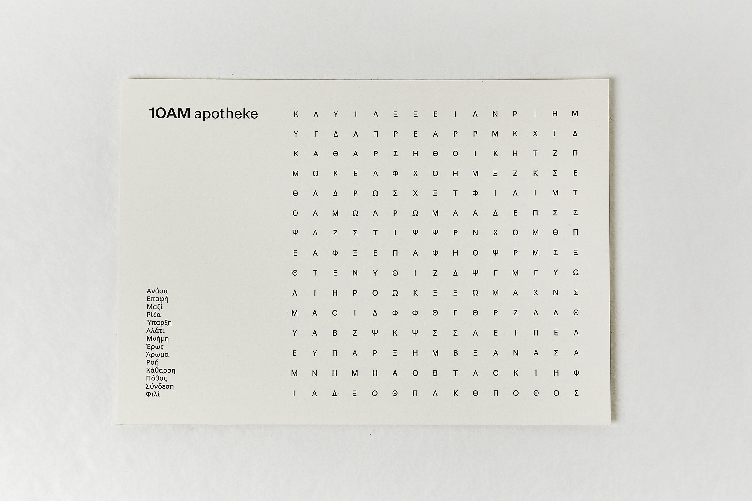 This collection of 6 postcards brings together sections of the glossary that inspired the subtle poetry of the 10AM apotheke collection in the form of a word search. Available in Greek and English.